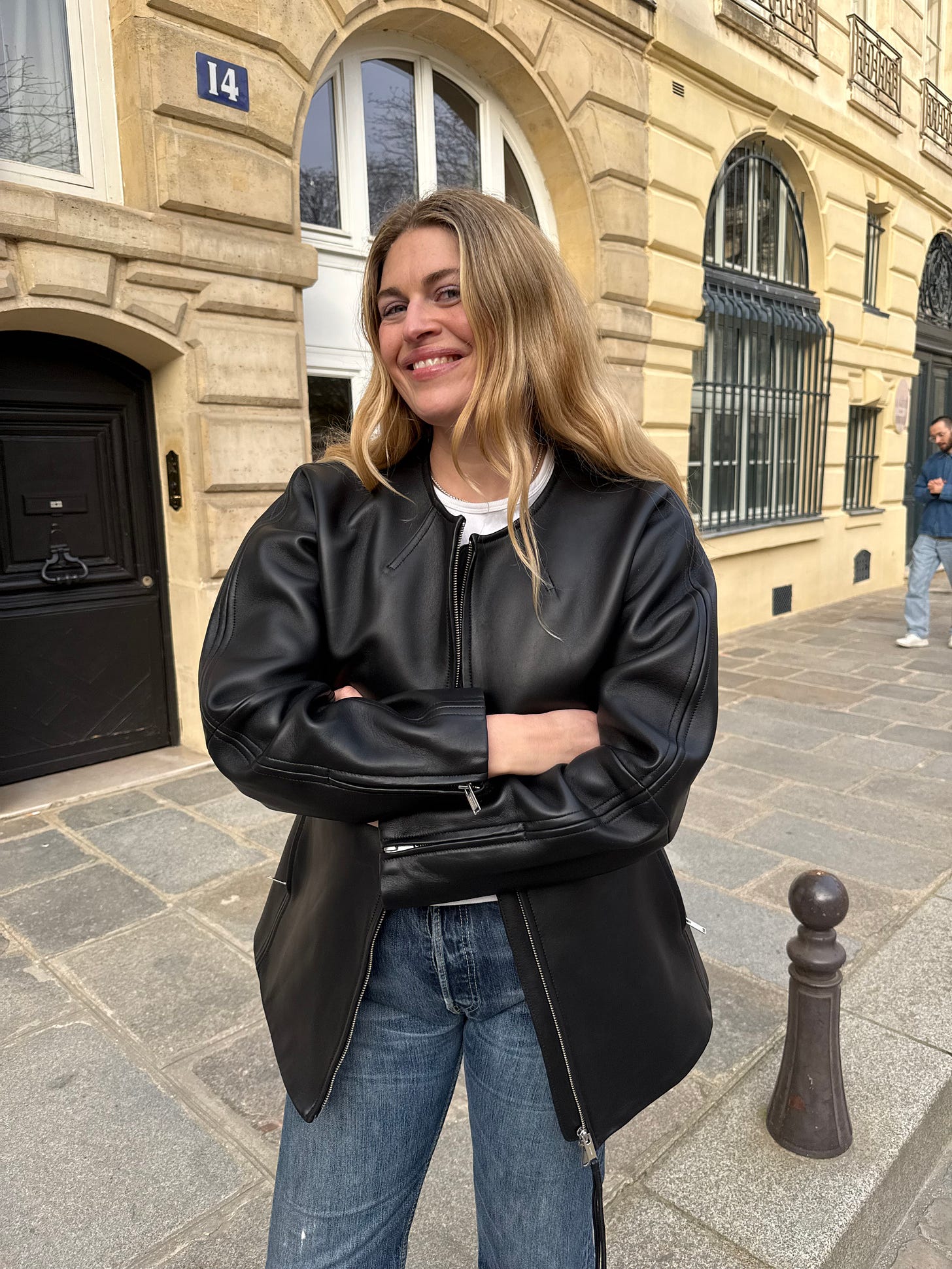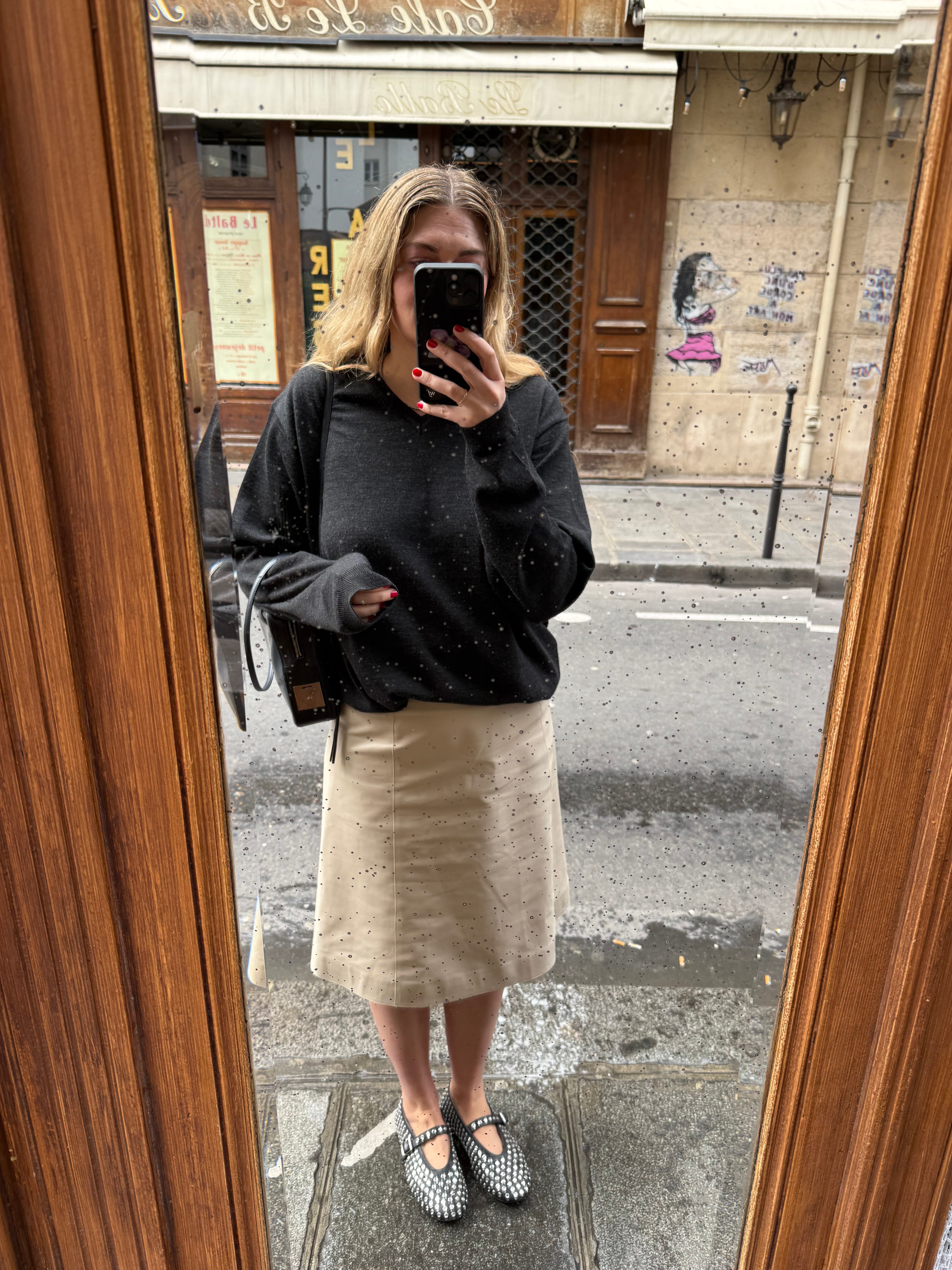 Not only does this jacket look like a million dollars, it is also (understandable) sold out. I wore it to look at people playing petanque at Place Dauphine while drinking to go wine in the sun. Perfect fit and activity. (If you are setting an alarm for availability please note that it’s small in size.) Arket leather goods are always amazing. I get a ton of compliments for this jacket that I wear three times a week at the moment.